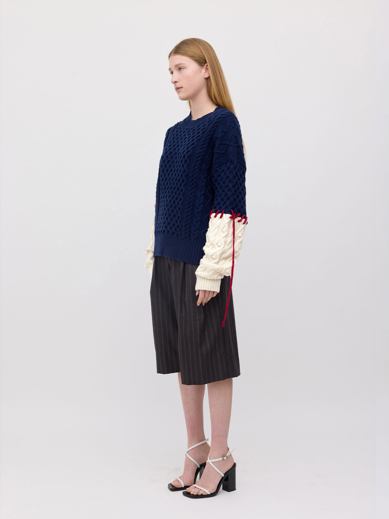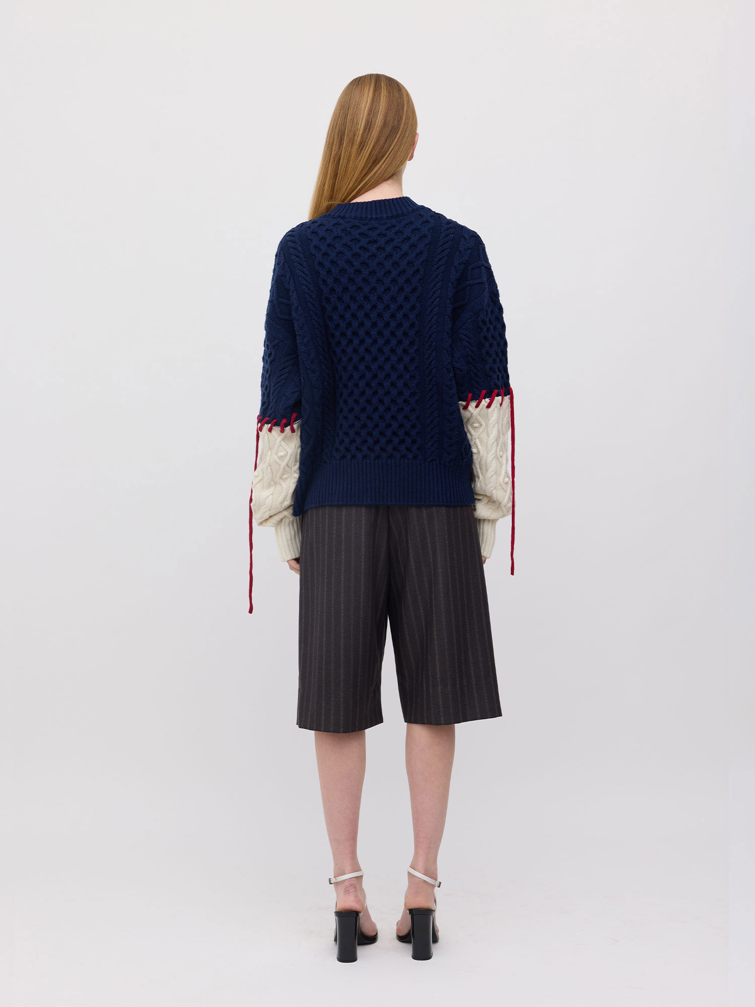 Basket Sleeve Stitch Merino Sweater Navy/Cream/Dark Red